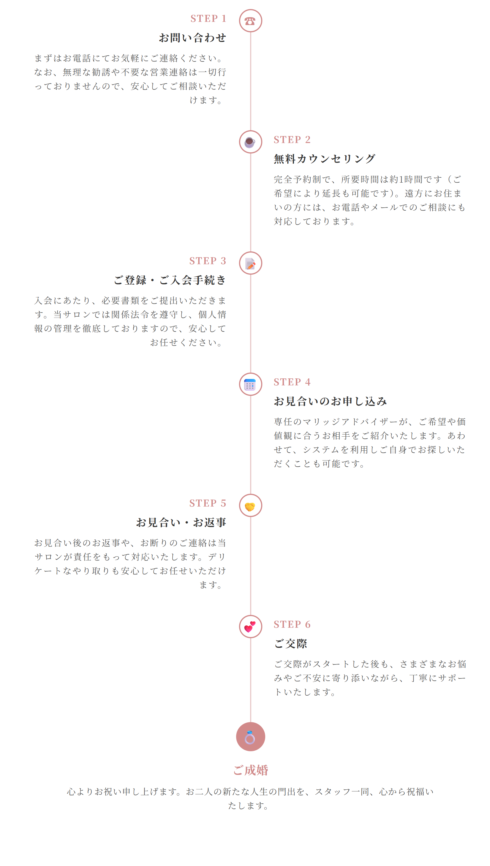 専任のマリッジアドバイザーが、あなたのご希望や価値観に沿ったお相手のプロフィールを毎月ご案内いたします。